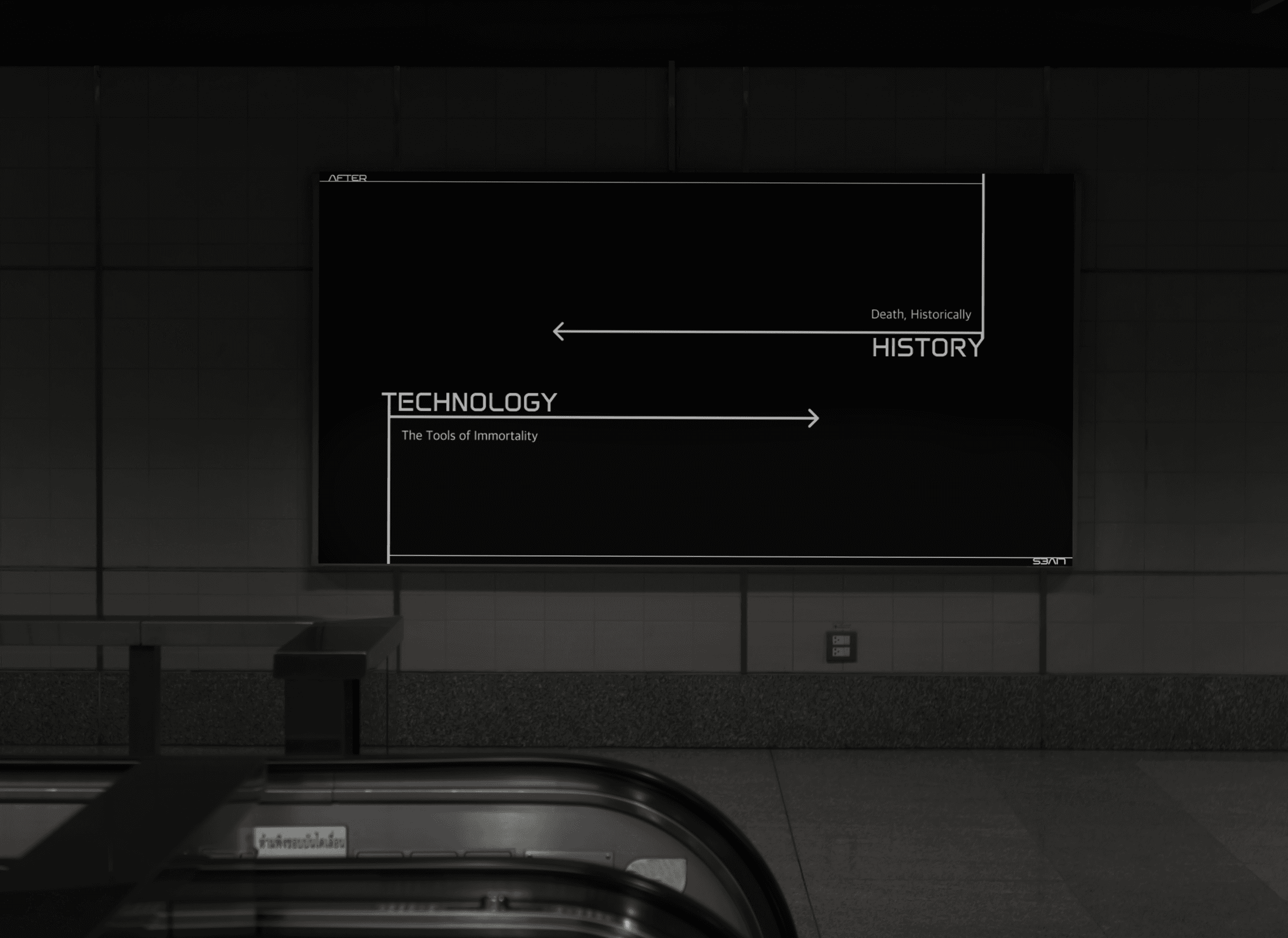 The exhibition wayfinding system creates a thoughtful journey through evolving perspectives on death and technology. Signage and environmental graphics serve both functional and narrative purposes, establishing tone and building anticipation as visitors move