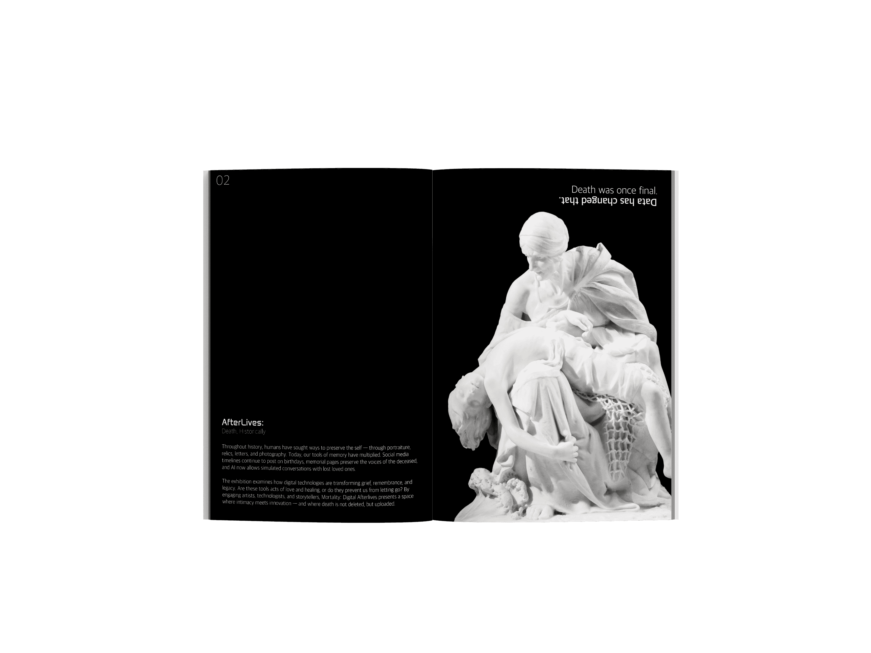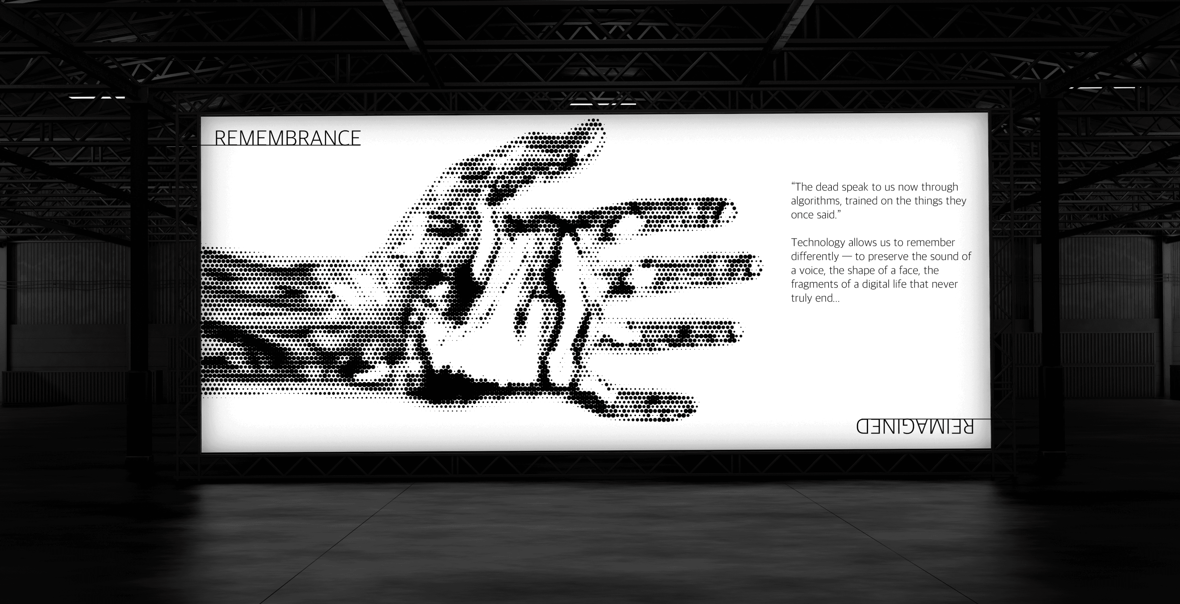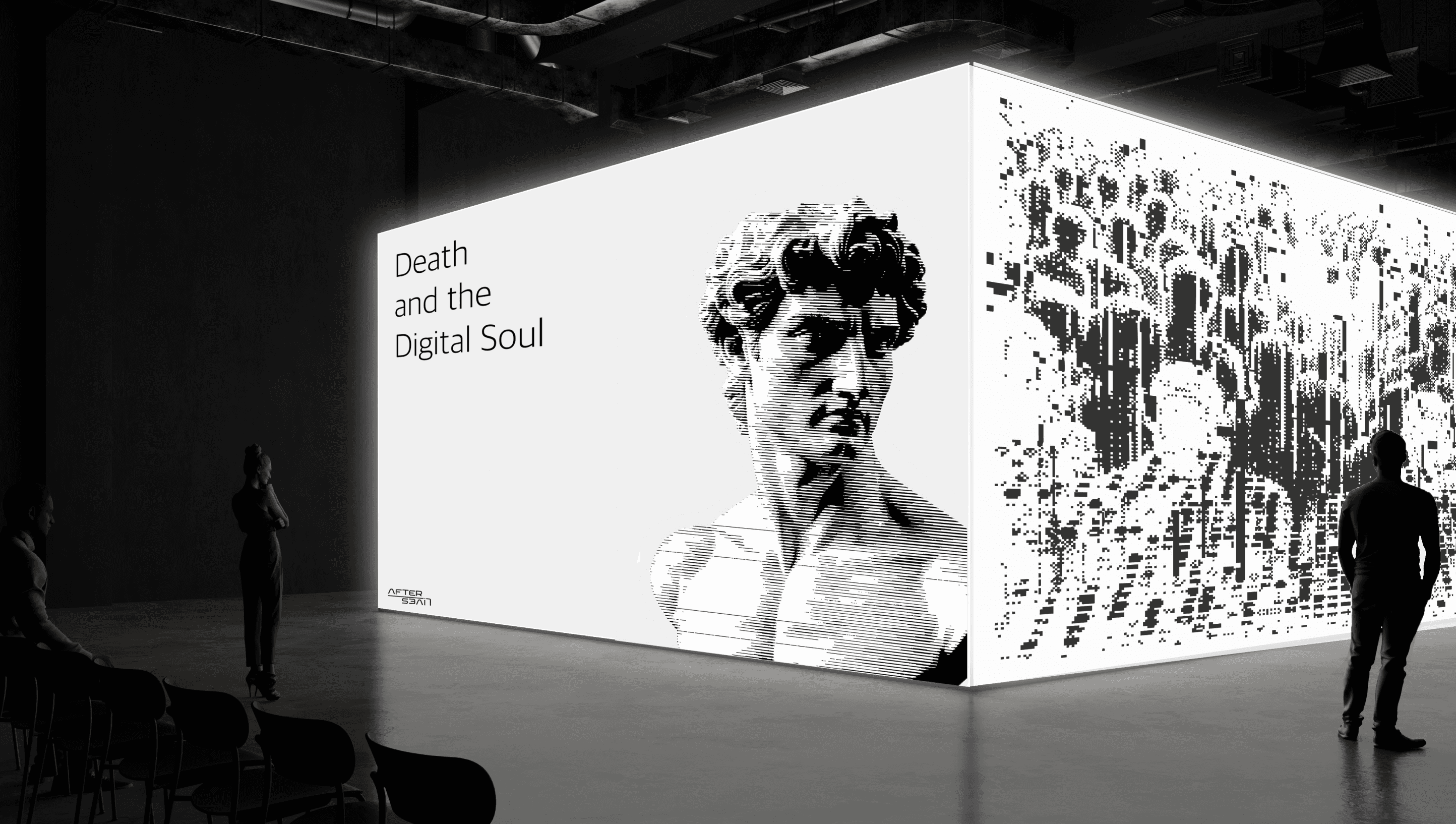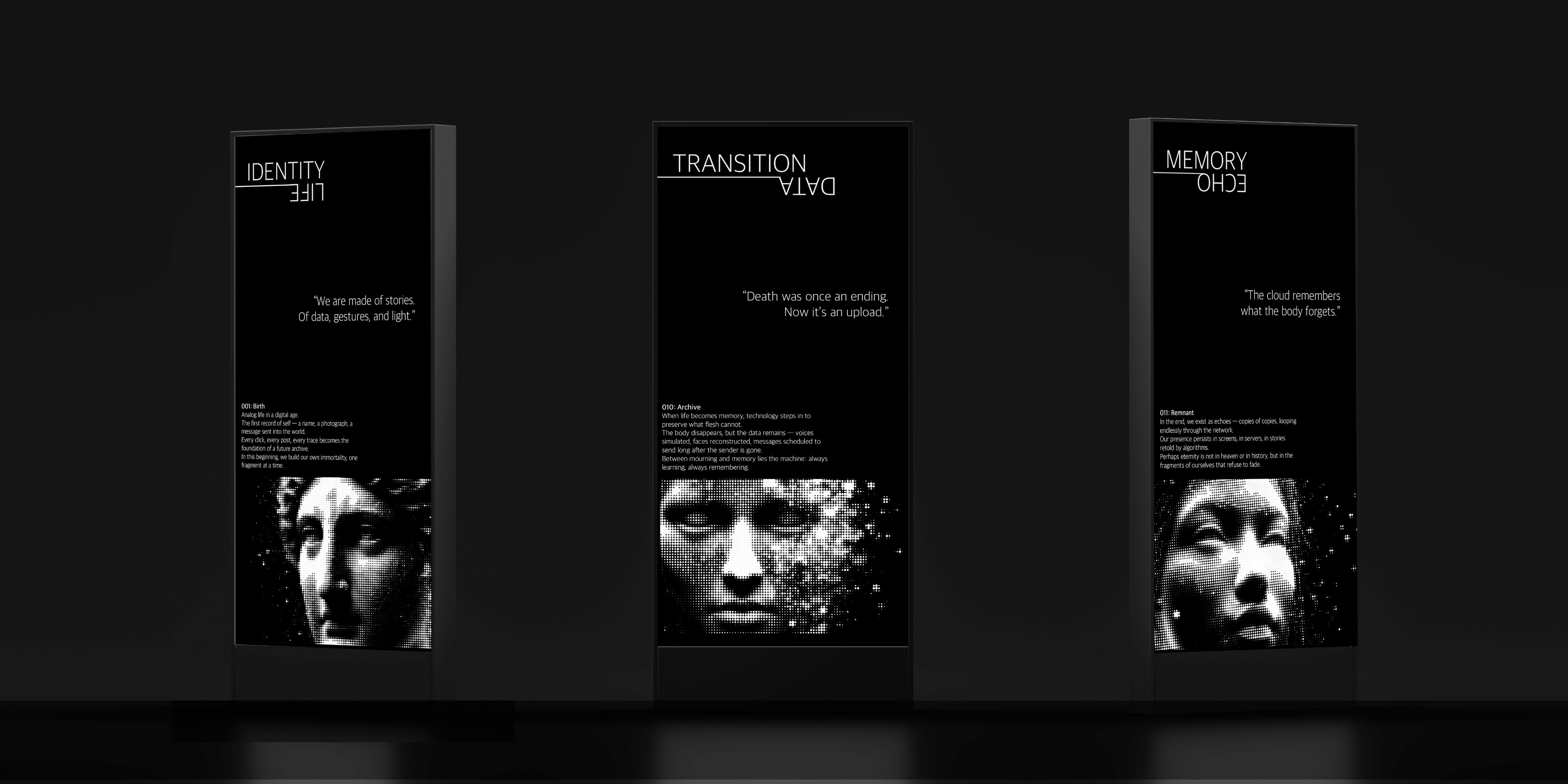 Thematic screens: Two main installations, the white "Remembrance" screen and the two-sided "Death and the Digital Soul" screen—serve as moments of pause and reflection within the exhibition