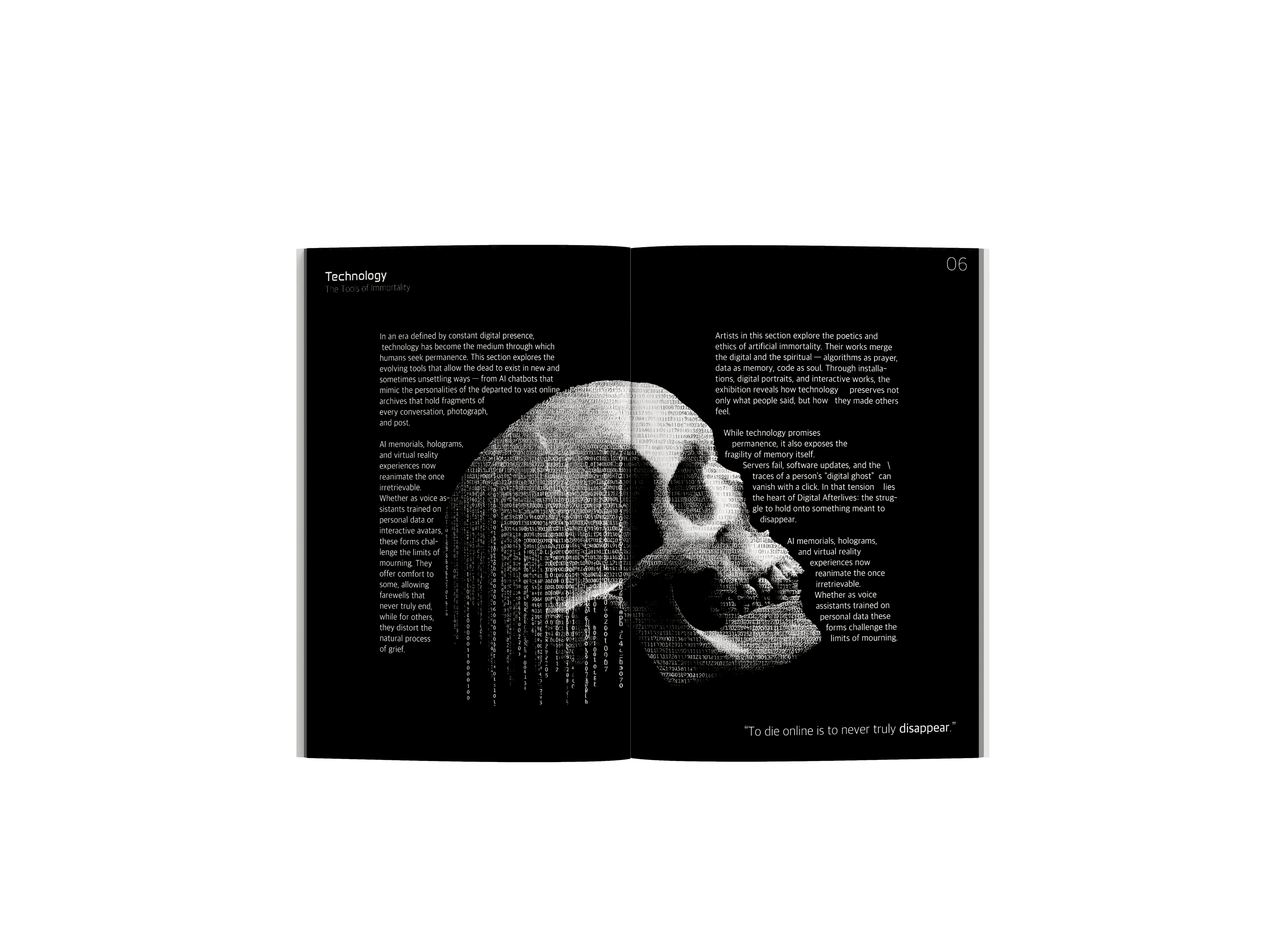 I wanted this exhibition to explore how technology has changed our understanding of death and remembrance. To humans, mortality was always the one guaranteed thing about life but that has changed. Social media memorial pages, AI chatbots trained on personal data, AI generated images and videos and the digital archives that allow people to still remain active in the lives of others after passing. The exhibition will have artworks, installations, and case studies that examine the tension and comfort that comes when mixing afterlife with technology.