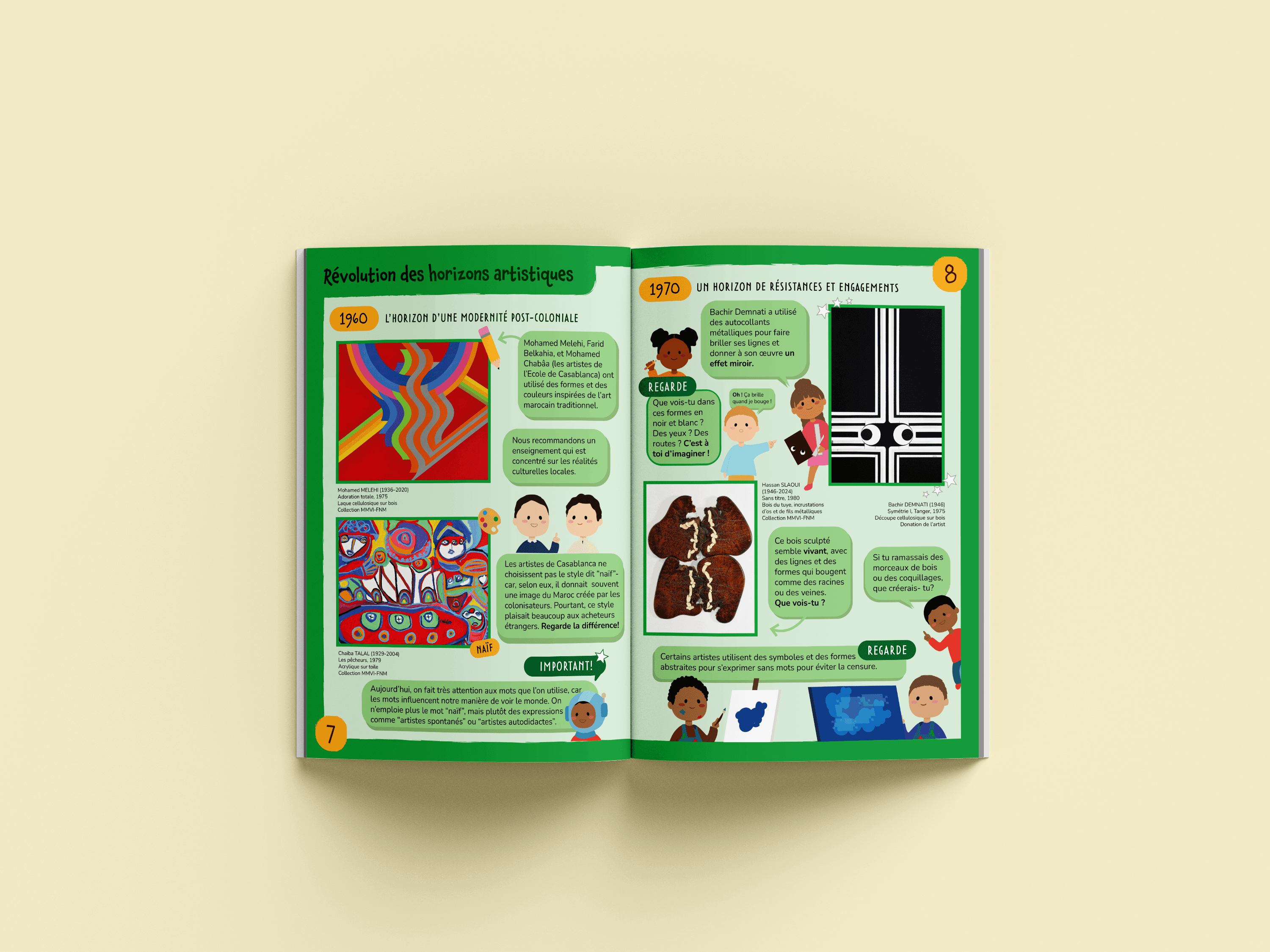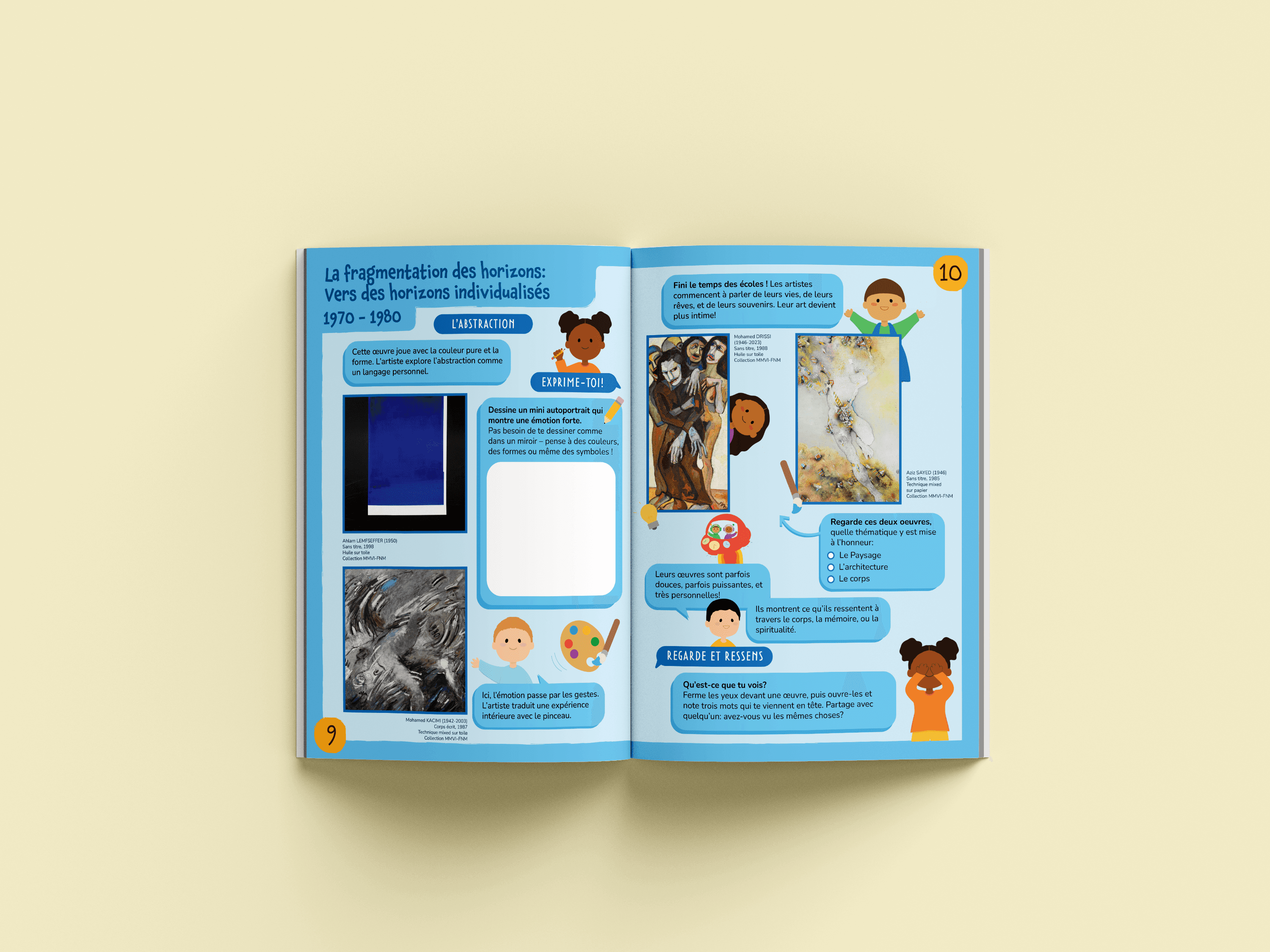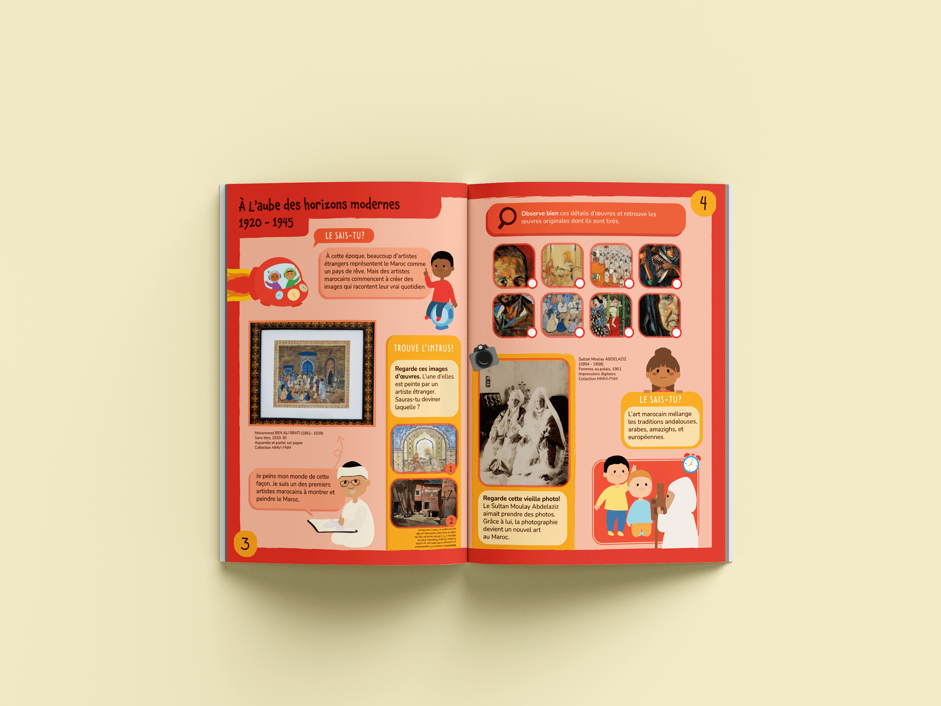 During my internship at the Musée Mohammed VI d'Art Moderne et Contemporain in Rabat, I was tasked with designing an educational pamphlet for children for the exhibition Horizon(s) en Mouvement. The exhibition traced 100 years of Moroccan art history from 1920 to 2020, presenting six thematic periods through distinct visual environments and color schemes.
