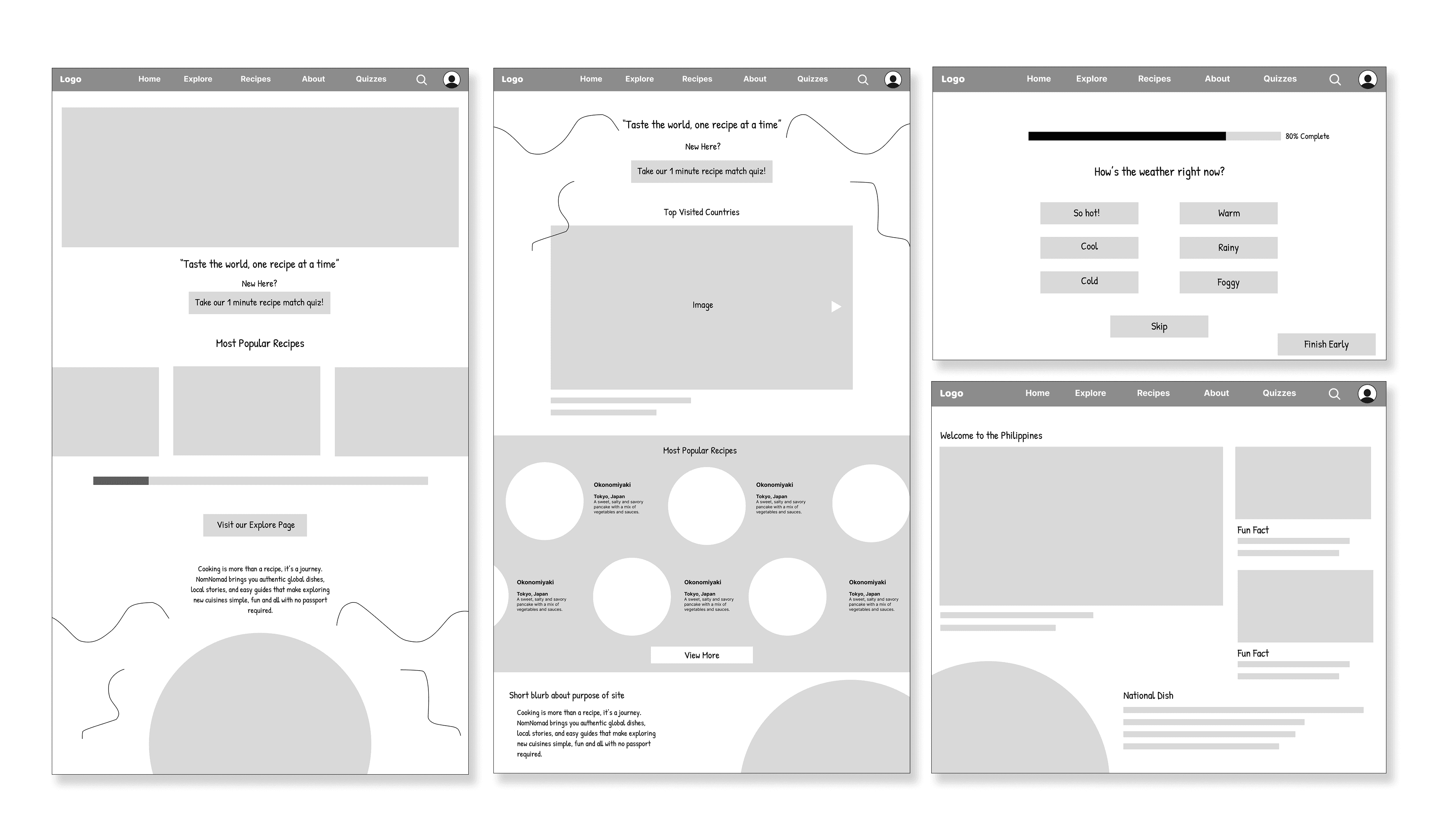 The early wireframes I created focused on establishing clear information architecture and user flow. I prioritized making recipes easy to find through visual-first navigation, I explored various layout patterns for search and filtering, and tested different approaches to presenting recipe content and cultural context.