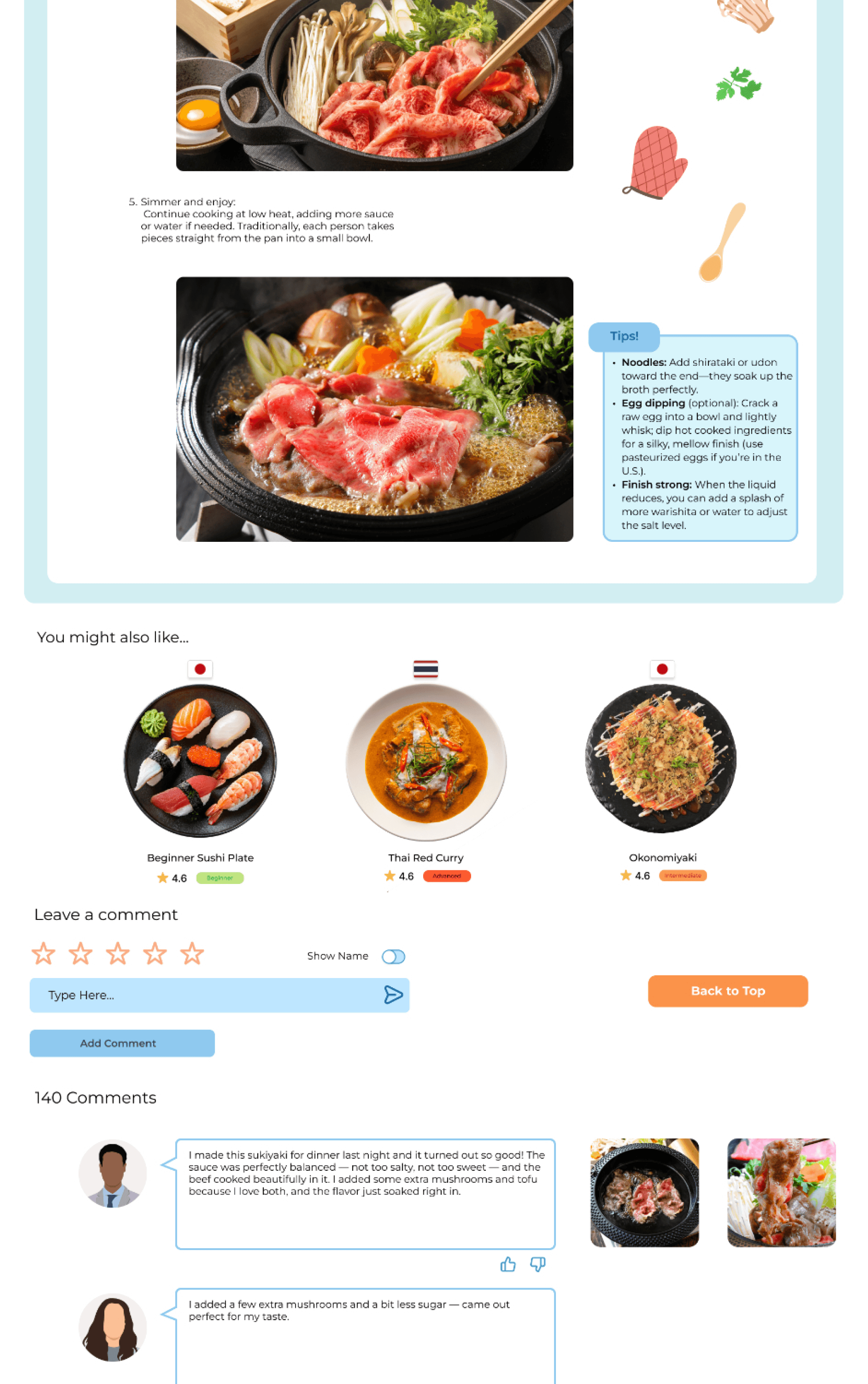 Signature dishes with difficulty and time indicators
