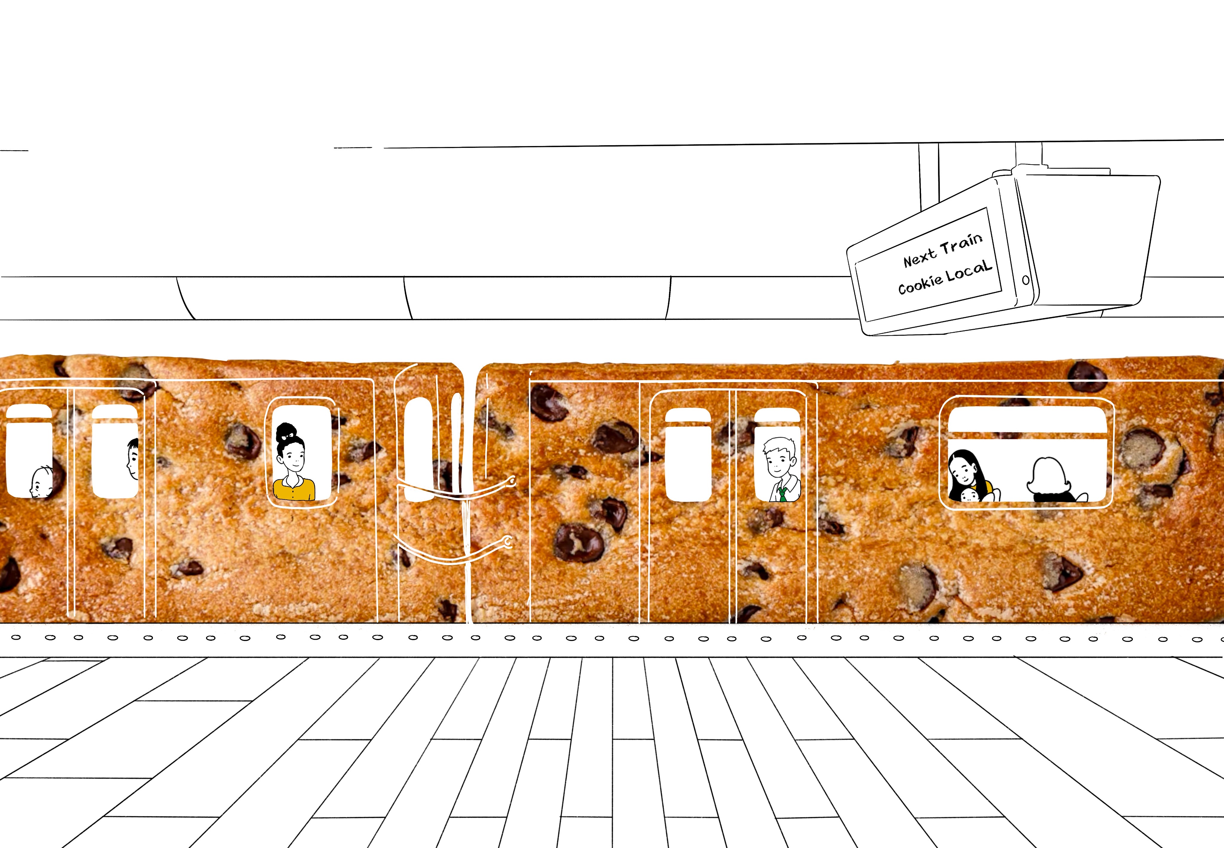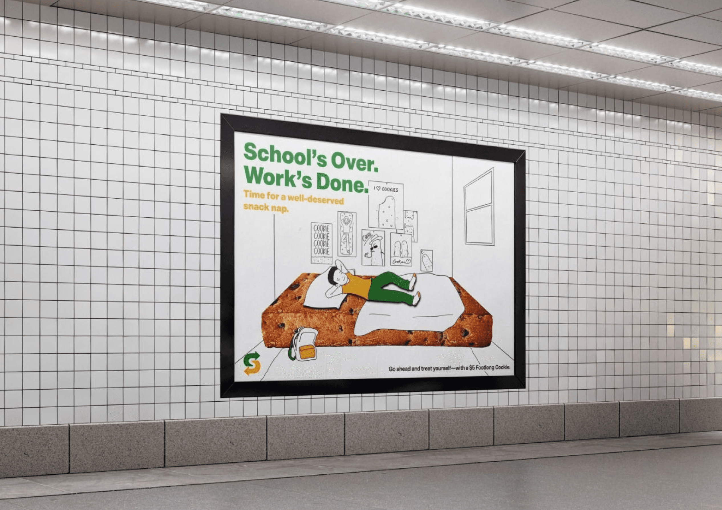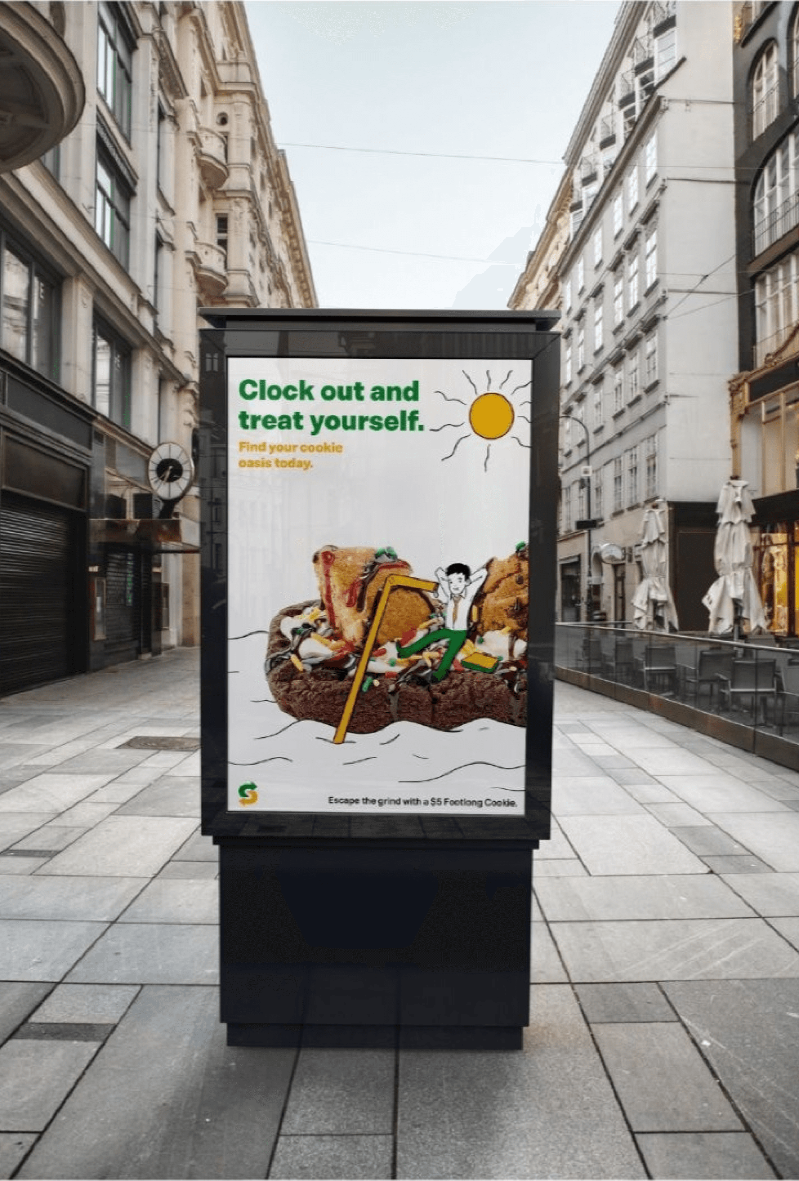 The final direction shifted to mixed-media collage, combining illustrated characters with photographic food elements and textures. This approach creates visual interest and authenticity, the illustrated figures feel aspirational and inclusive, while real food photography emphasizes Subway's fresh cookies.